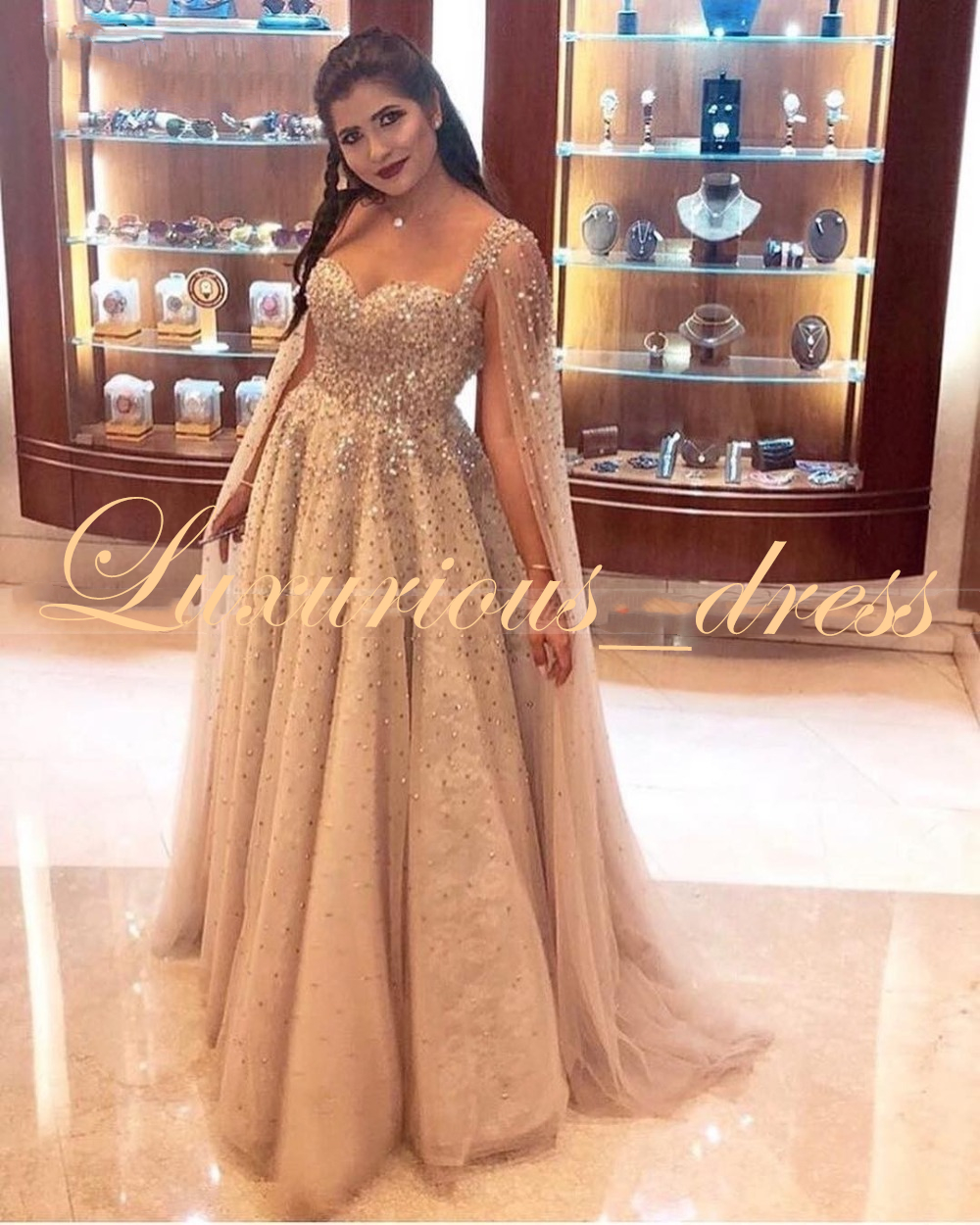 Dubai Women Evening Dresses Plus Size 2020 Luxury Pink Beaded Crystal Arabic Prom Dress With Cape Champagne Green Formal Gowns Evening Dresses Aliexpress